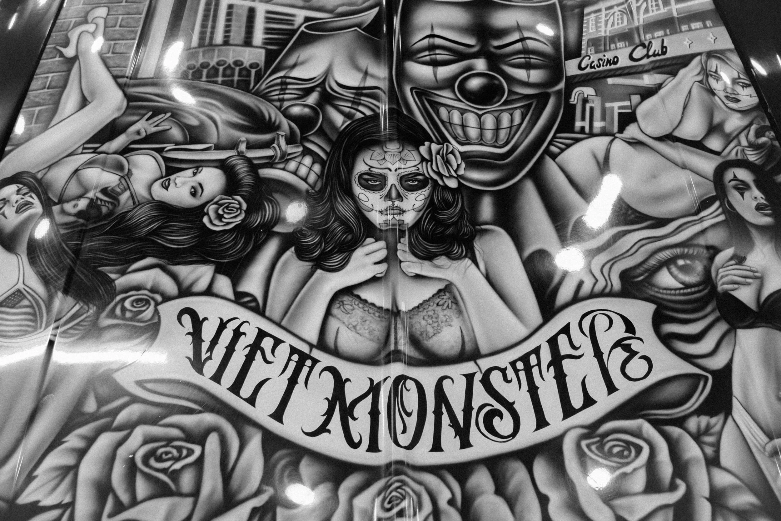 Upstairs in the tattoo parlour, I found Simba, the 65kg XL pitbull, splayed out on the floor. An artist from Compton worked away, designing a dye job on his fur. Mike introduced me to Thao, the owner and founder of VietMonster. Boasting a significant Instagram presence for his Chicano tattoos, Thao exemplifies how Vietnamese individuals are putting their mark on traditional Western subcultures.